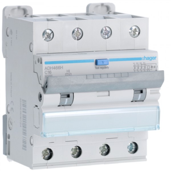 Диференційний автоматичний вимикач Hager 4P 6kA C-16A 30mA Hi (ADH466H)