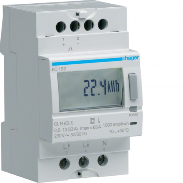 1-Фазный счетчик Hager прямого подключения 2-тарифный 63А, 3м (EC152)