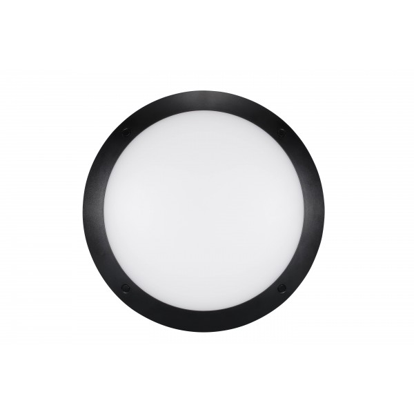 Светодиодный светильник Sensor Dim для наружного монтажа, диаметр 350 мм, максимальный световой поток 1450 лм, регулируется до 1400 лм внутренним переключателем, максимальная потребляемая мощность 14 Вт, светоотдача 104 лм/Вт, цветовая температура 3000 K, CRI80, IP66, IK10, срок службы 50 000 часов (L70), черный корпус, вандалозащищенный. Встроенный микроволновый датчик присутствия с функцией сбора дневного света, диммирования и коридорного режима, поставляется с винтами, защищающими от кражи.