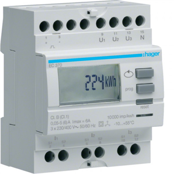 3-Фазный счетчик Hager непрямого подключения 2-тарифный, 4м (EC372)