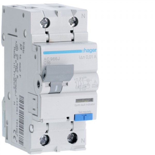 Дифференциальный автоматический выключатель Hager 1+N, 16A, 10 mA, С, 6 КА, A, 2м (AC966J)