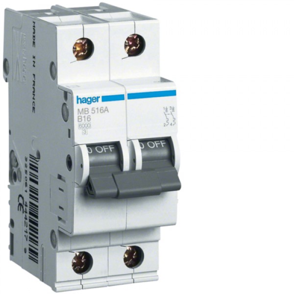 Автоматический выключатель Hager 1P+N 6kA B-16A 2M (MB516A)