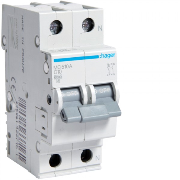 Автоматический выключатель Hager 1P+N 6kA C-10A 2M (MC510A)