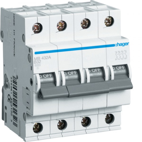 Автоматический выключатель Hager 4P 6kA B-32A 4M (MB432A)