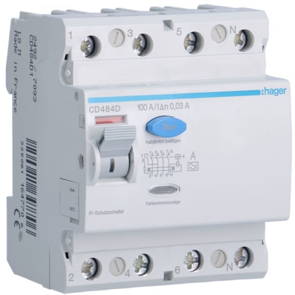 Устройство защитного отключения Hager 4P 100 A, 30 mA, A, 4м (CD484D)