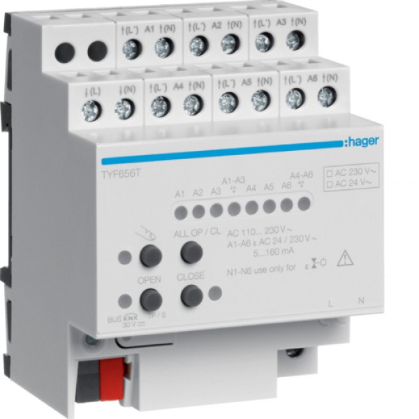 Исполнительное устройство Hager для систем отопления KNX, 6-канальное, Triac, 230В/24В (TYF656T)