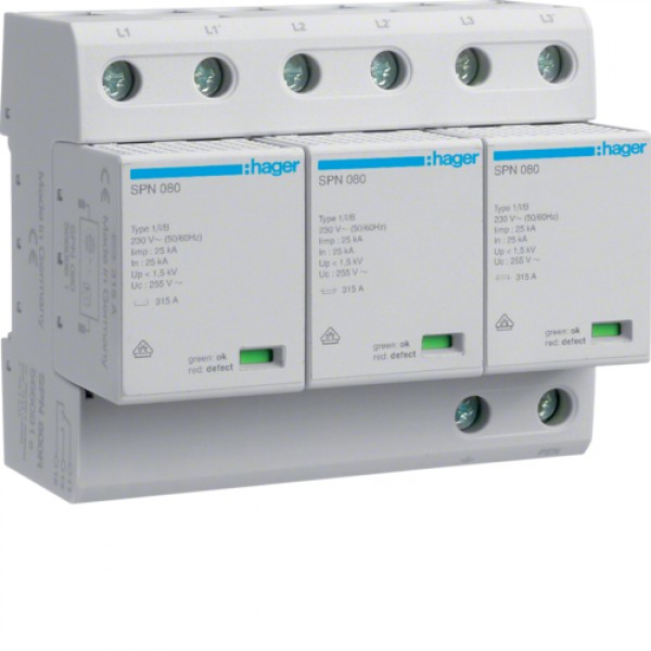 Комбинированный разрядник Hager, клас 1+2,сменный,с индикацией и доп. контактом,TNC,3п,75kA (SPN800R)
