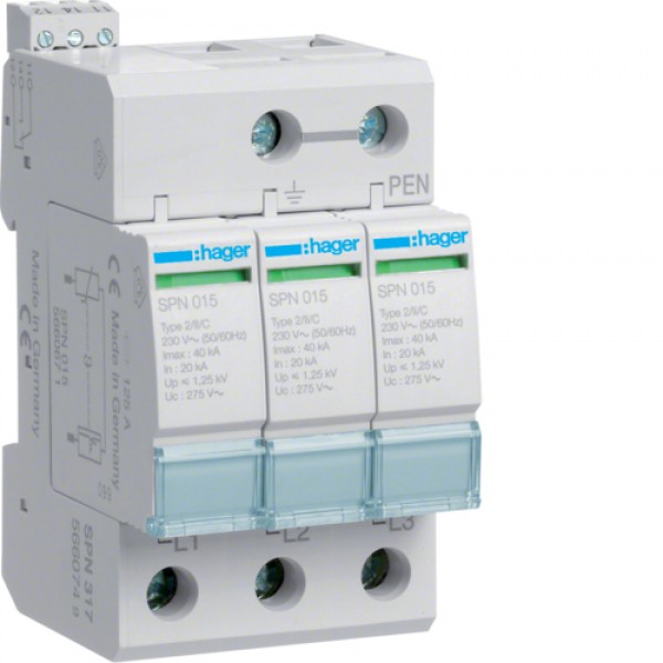 Разрядник Hager класса 2, c доп.контактом, 3п, 40kA, Up<=1,25kB (SPN317)