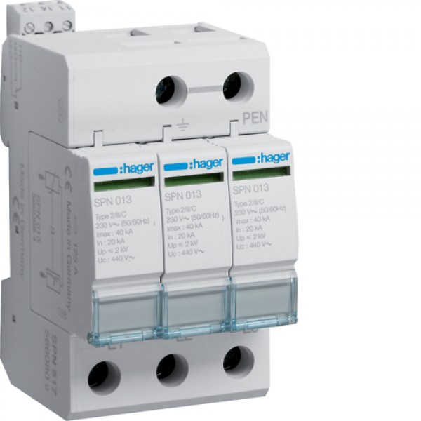 Разрядник Hager класса 2, c доп.контактом, 3п, 40kA, Up<=2kB (SPN517)