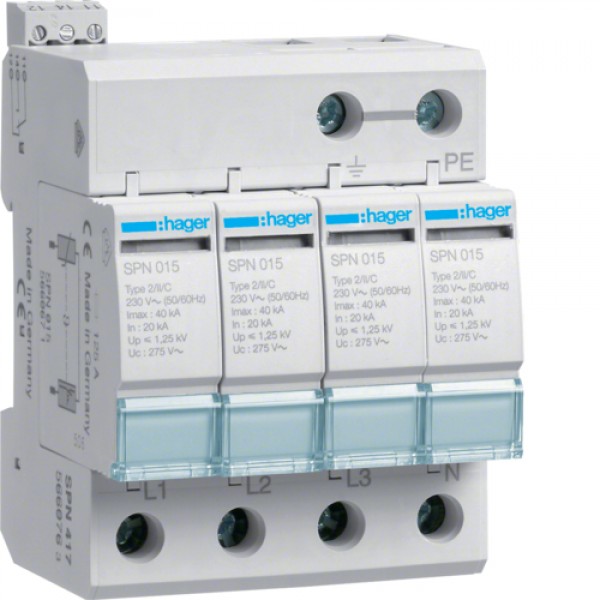 Разрядник Hager класса 2, c доп.контактом, 4п, 40kA, Up<=1,25kB (SPN417)